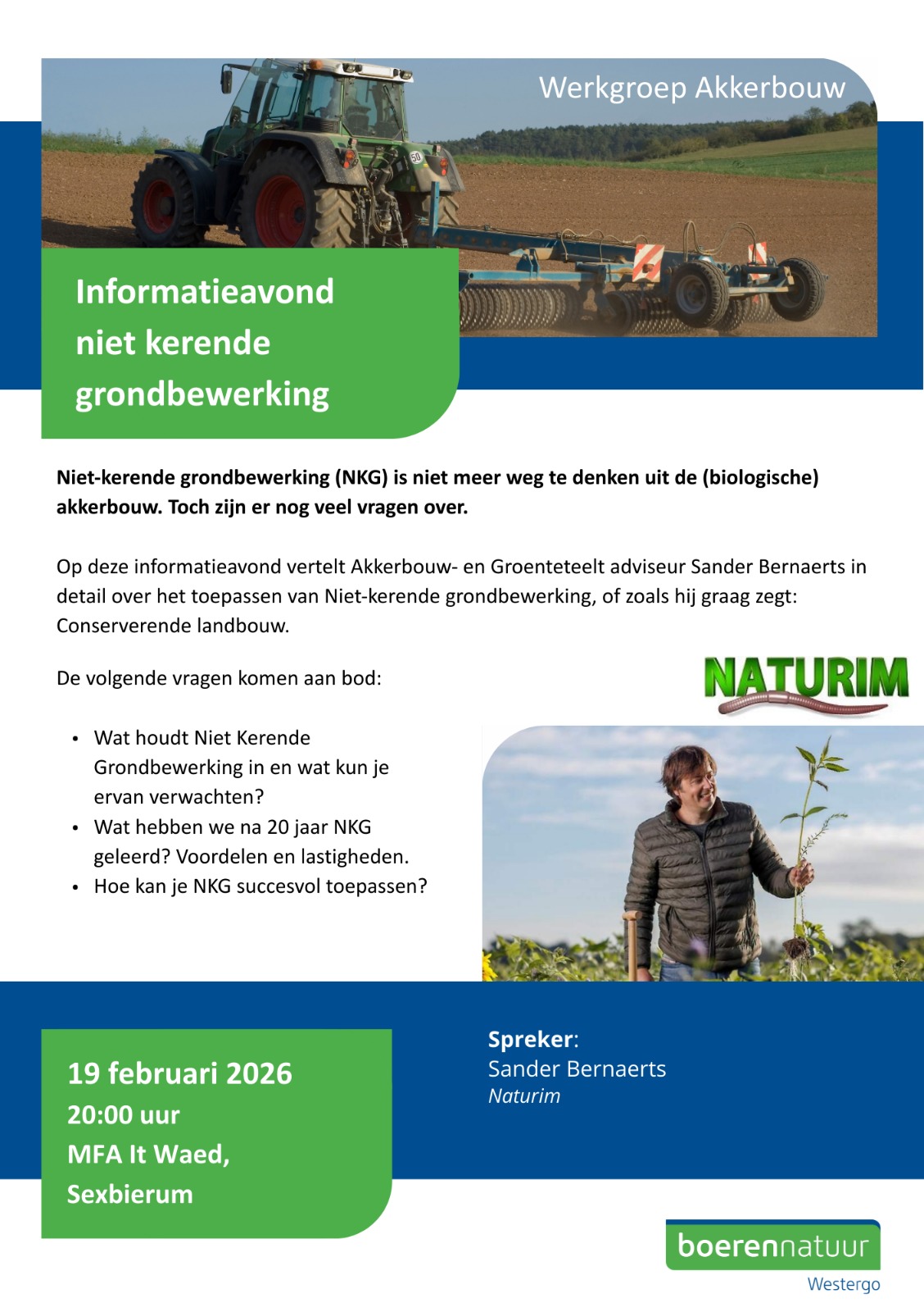 BoerenNatuur Westergo organiseert op donderdag 19 februari een informatiebijeenkomst over niet kerende grondbewerking. Deelnemers van Waadrâne zijn ook welkom om deze bijeenkomst bij te wonen.