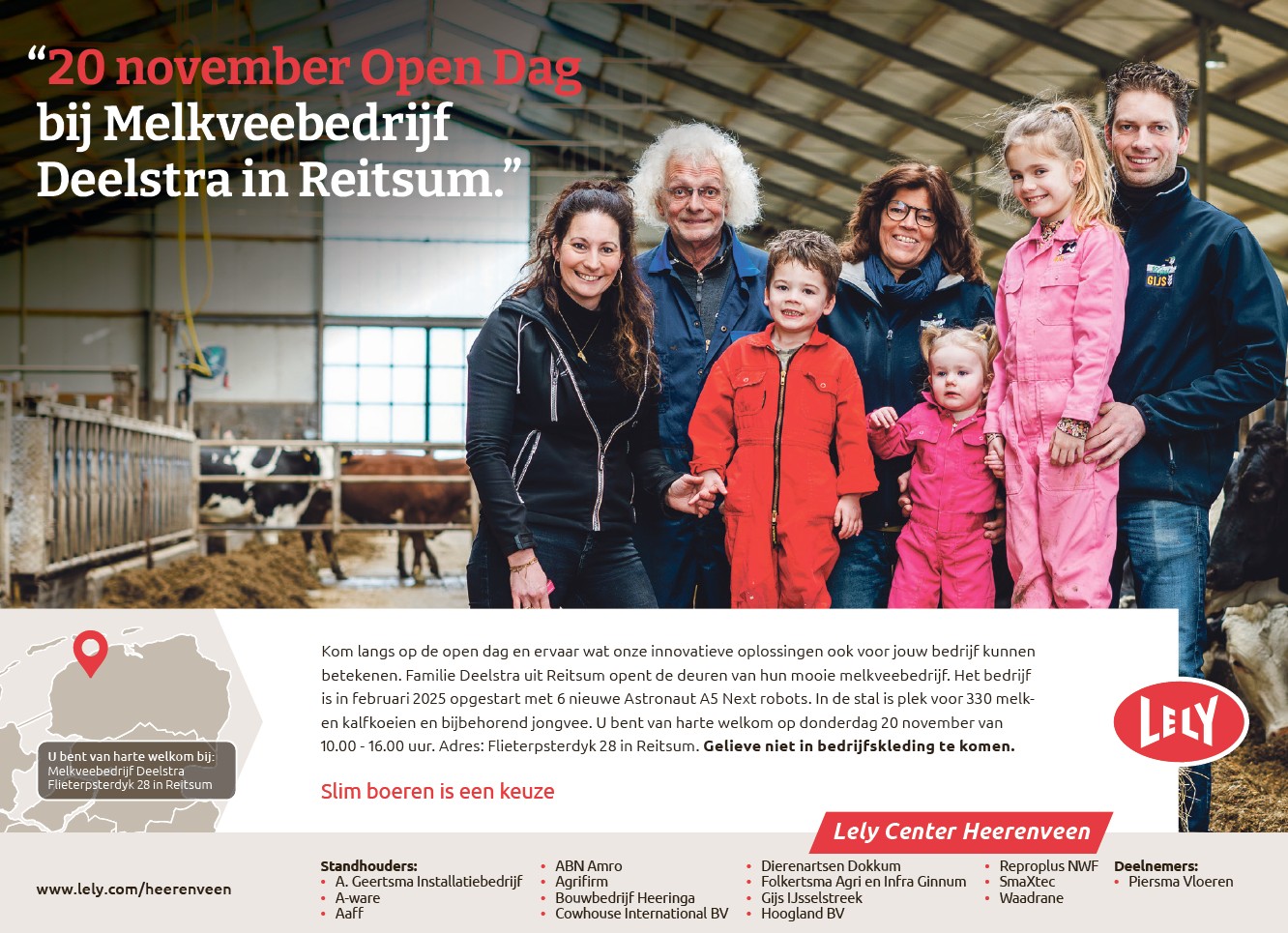 Kom op 20 november langs bij het melkveebedrijf van familie Deelstra in Reitsum en maak kennis met de zes innovatieve Astronaut A5 Next melkrobots die sinds februari 2025 in gebruik zijn. Tijdens deze open dag krijg je een unieke kans om de nieuwste technologie in de melkveehouderij van dichtbij te ervaren.